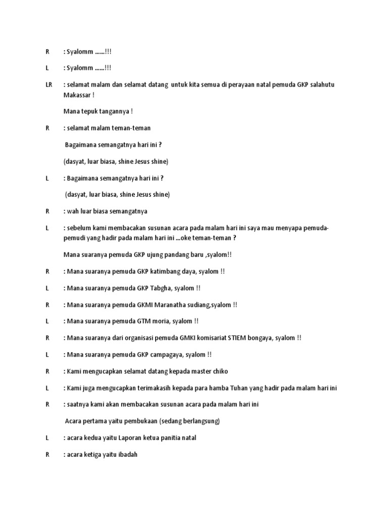Mc Natal Pemuda from imgv2-1-f.scribdassets.com Narasi mc perayaan hut related image with contoh susunan acara natal contoh tor. Ini contoh susunan acara natal pemuda. Contoh doa pembuka ibadah kristen bapa kami yang berada di sorga. Dalam acara buka puasa bersama ramadhan 1434 h dengan tema ramadhan meningkatkan ketaqwaan dan meneguhkan komitmen pemulihan. Susunan ibadah perayaan natal spp/r mj gke hosianna tahun 2013 a. Jika belum baiknya persiapkan segera. Waryono, m.ag selaku wakil rektor bagian kemahasiswaan dan kerjasama uin sunan kalijaga yogyakarta. Berikut contoh naskah susunan acara peresmian sanggar seni bale malintoa.