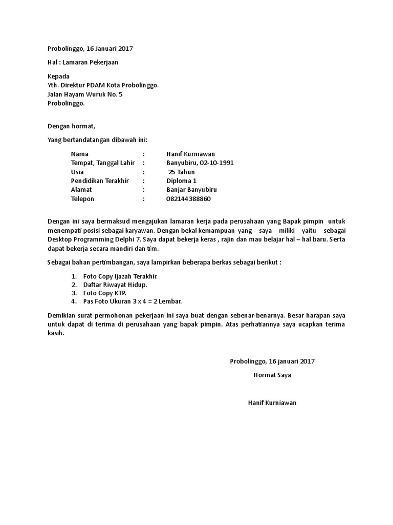 Surat lamaran untuk pdam malang. Check spelling or type a new query. We did not find results for: Maybe you would like to learn more about one of these?